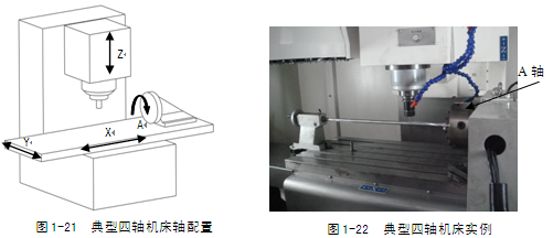 如图1-22所示,这类机床是在三轴立式数控铣床或加工中心上,附加具有一个旋转轴的数控转台来实现四轴联动加工,即所谓3+1 形式的四轴联动机床。由于是基于立式铣床或加工中心作为主要加工形式,所以数控转台只能算作是机床的一个附件。这类机床的优点是: