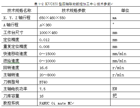 表1-2 KVC650型四轴联动数控加工中心技术参数
