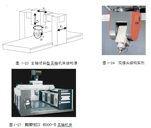 如图1-25所示是西班牙ZAYER公司生产的MEMPHIS 6000-U型双摆头机床,该机床的五根运动轴分别为直线轴X、Y、Z和绕X轴旋转的A轴、绕Z轴旋转的C轴。