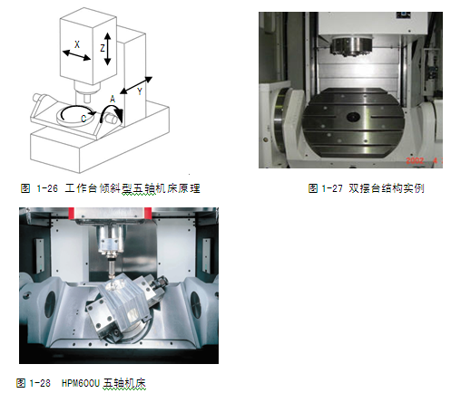 如图1-28所示是瑞士MIKRON公司生产HPM600U型双摆台机床,该机床的五根运动轴分别为直线轴X、Y、Z和绕X轴旋转的A轴、绕Z轴旋转的C轴。