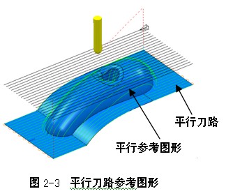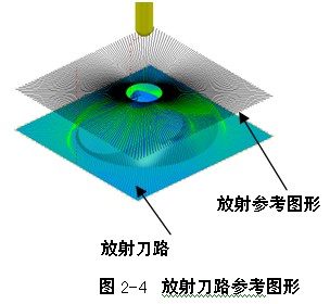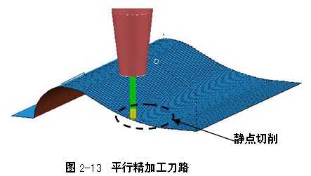 如图2-13所示刀具路径,为三轴精加工刀路,刀轴在加工过程中,始终保持垂直状态。在铣削零件的浅滩区域时,球头刀的主要工作部位在球头上线速度为零的点,这种切削状态我们称之为静点切削。这种静点切削状态下加工出的型面表面质量较差。