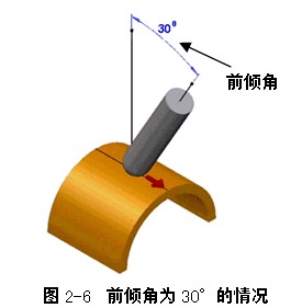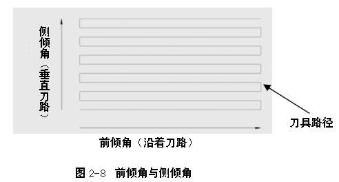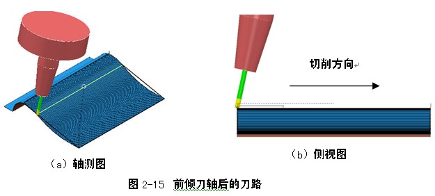 (1)前倾角:沿着刀具路径前进的方向定义一个刀具轴倾斜角度,如图2-6所示为前倾角30°的情况。它从刀路前进方向的垂直线开始测量。