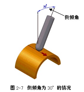 (2)侧倾角:在刀具路径前进方向的垂直方向定义一个刀具轴倾斜角,如图2-7所示为侧倾角30°的情况。它也是从刀路前进方向的垂直线开始测量,0°时,刀具轴为垂直状态。