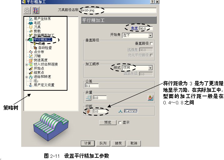 [技巧]在调试程序时,可以将行距和公差值设置得大些,这样可以加快计算速度,有利于反复修改参数。待加工策略的其它参数最终确定后,再将行距和公差值设置到合理范围。
