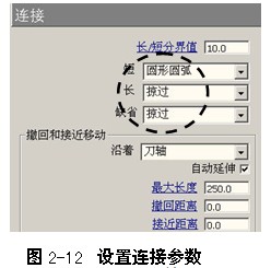在平行精加工表格的策略树中,双击切入切出与连接树枝,将它展开。单击连接树枝,调出连接选项卡,按图2-12所示设置连接参数。