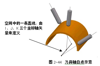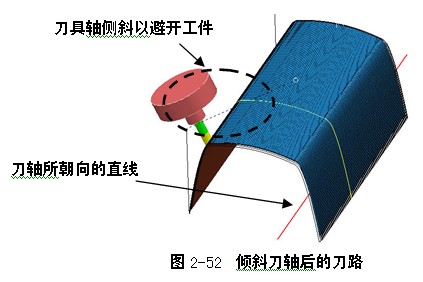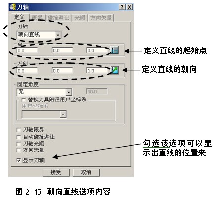 朝向直线刀轴矢量控制方法使刀具轴保持朝向一根读者自定义的空间直线。刀具刀尖部位指向所设定的直线。这个选项同朝向点刀轴矢量选项相类似,不同之处在于,刀具轴指向的不是一个固定的点,而是一根固定的直线。在加工过程中,刀具刀尖部分将相对静止,而机床的主轴头部分则运动较频繁,如图2-44所示。