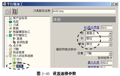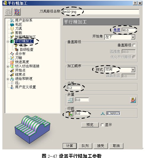 ,打开策略选取器对话框,在精加工选项卡中选择平行精加工,单击“接受”按钮打开平行精加工表格,按图2-47所示设置平行精加工参数。
