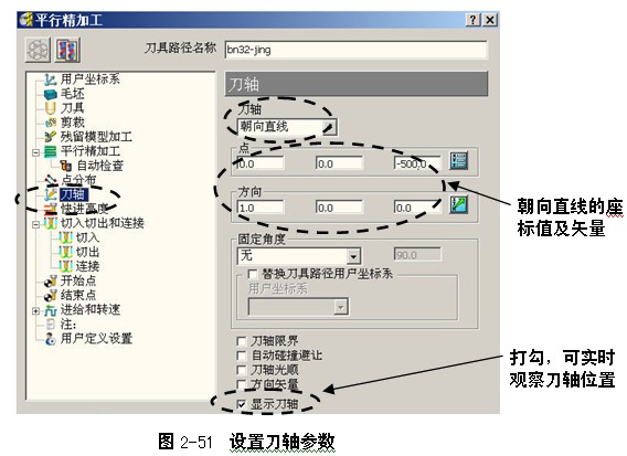 ,激活表格参数。在平行精加工表格中的策略树中,单击刀轴树枝,调出刀轴选项卡,按图2-51所示设置刀轴参数。