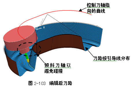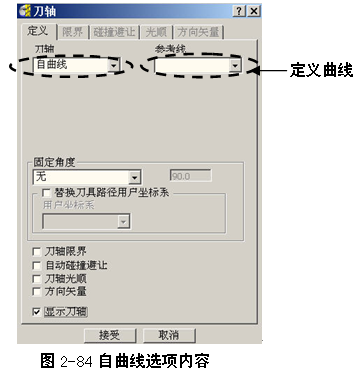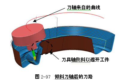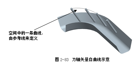 自曲线定义刀轴矢量通过一条读者定义的曲线。同朝向曲线相类似,用于控制刀轴矢量的曲线需要预先使用参考线工具创建出来。刀轴矢量控制方式为自曲线控制时,在加工过程中,刀具刀尖部分保持连续运动,而机床的主轴头部分保持相对静止,如图2-83所示。