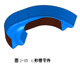 如图2-85所示零件是一个U形槽零件。这个零件加工的困难之处在于,零件内型面最深处为160mm,并且整个零件的形状比较特殊,如何使用较短的刀具规划出行距均匀的刀具路径来是本例的重点。