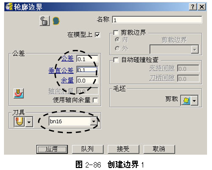(1)在PowerMILL资源管理器中,右击边界树枝,在弹出的快捷菜单条中选择“定义边界”→“轮廓”,打开轮廓边界对话框,按图2-86所示设置参数。