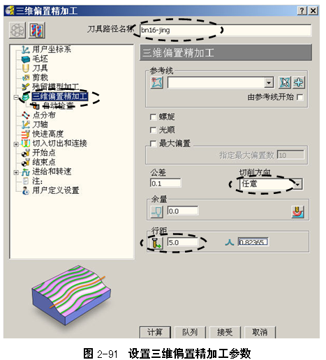 ,打开策略选取器对话框,在精加工选项卡中选择三维偏置精加工,单击“接受”按钮打开三维偏置精加工表格,按图2-91所示设置精加工参数。