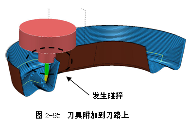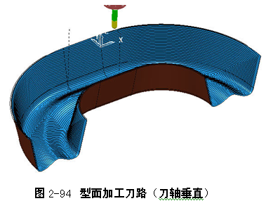 请读者注意,如图2-97所示刀路,还存在有两个问题,一是三维偏置刀路存在有两个方向的走刀,会在型面上留下交叉纹路,对于一些要求严格的模具零件,这种交叉纹路是不允许存在的。另一个问题是,加工过程如由于频繁更改走刀方向,导致机床主轴头(或工作台)运动过频,范围过大,这也是不太好的。下面通过加入一根引导线来解决这两个问题。