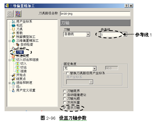 ,激活表格参数。在三维偏置精加工表格的策略树中,单击刀轴树枝,调出刀轴选项卡,按图2-96所示设置刀轴参数。