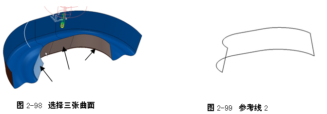 (2)创建一条用于引导刀路的参考线:在绘图区选择图2-98所示三张曲面,在PowerMILL资源管理器中右击参考线树枝,在弹出的快捷菜单条中选择“产生参考线”,系统即产生出一条名称为2,内容为空的参考线。