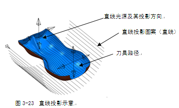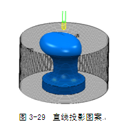 直线投影精加工策略投影一个圆柱(或者是圆柱面的一部分)参考图线到模型表面,圆柱的中心线为一根直线光源。通俗地,也可以理解为一根白炽灯管发出的光线以圆形、螺旋线或直线参考图形的形式投射到模型表面上形成刀具路径,如图3-23所示。