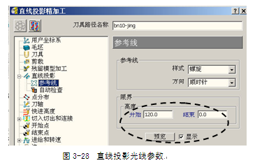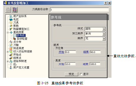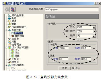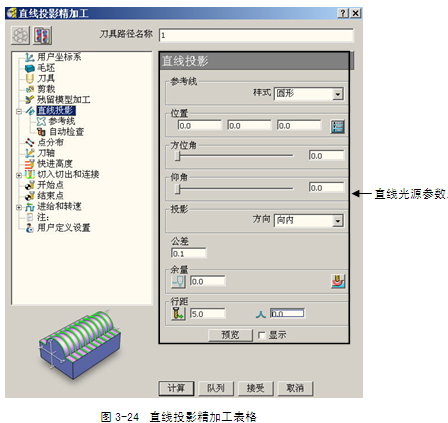 2在设置直线投影参数时,往往需要进行反复的调整,这时可以勾选“显示”复选框,然后单击“预览”按钮来查看直线投影图案,如果图案的大小和位置不合适,则可以马上调整投影参数。如果在计算完刀具路径之后发现刀路不合适,再来调整就会增加刀路计算时间。