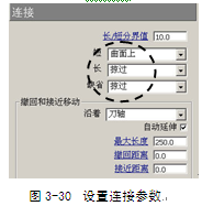 在直线投影精加工表格的策略树中,双击切入切出与连接树枝,将它展开。单击连接树枝,调出连接选项卡,按图3-30所示设置连接参数。