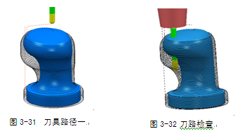 如图3-31所示三轴刀具路径,刀具在切入到把手中间型面时,如图3-32所示,刀具的刀体、夹持会与零件发生碰撞。下面改变刀轴矢量来避免出现碰撞。