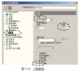 ,重新激活表格参数。在直线投影精加工表格的策略树中,单击刀轴树枝,调出刀轴选项卡,按图3-33所示设置刀轴参数。