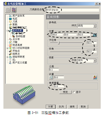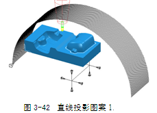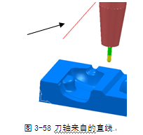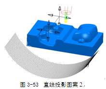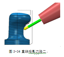 直线投影精加工的直线光源允许是非铅直光源,例如用得较多是水平直线光源,这种策略配合朝向直线或自直线刀具轴指向控制一块使用可以编制出类似于瓶身模具零件型面非常完美的刀具路径。