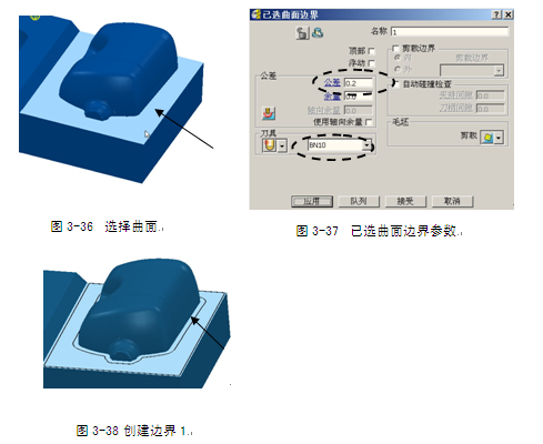 在PowerMILL资源管理器中右击边界树枝,在弹出的快捷菜单条中选择“定义边界”→“已选曲面”,打开已选曲面边界对话框,按图3-37所示设置参数,然后单击“应用”按钮,计算出如图3-38所示边界线。