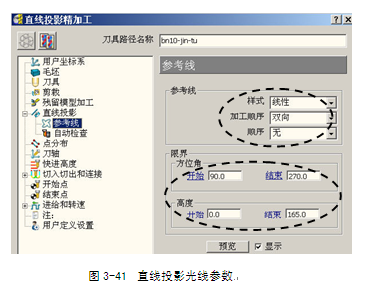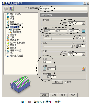 (1)设置精加工参数:打开直线投影精加工表格,按图3-40所示设置加工参数。
