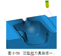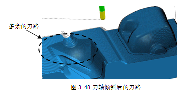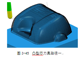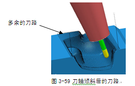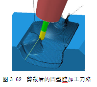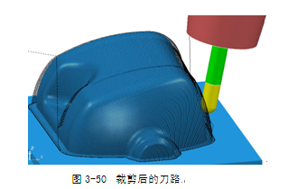 如图3-59所示刀路,有一部分路径落在零件的分模平面上了,这是不需要的,下面使用刀路剪裁工具来修剪刀路以达到理想效果。
