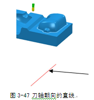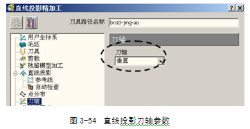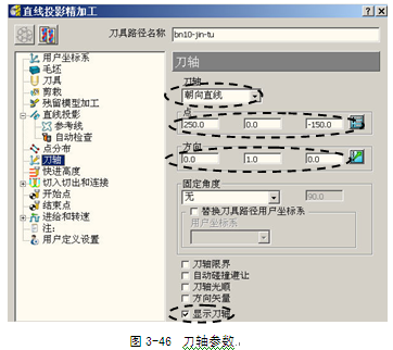 ,重新激活表格参数。在直线投影精加工表格的策略树中,单击刀轴树枝,调出刀轴选项卡,按图3-46所示设置刀轴参数。