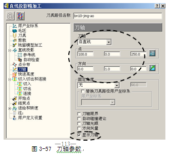 ,重新激活表格参数。在直线投影精加工表格的策略树中,单击刀轴树枝,调出刀轴选项卡,按图3-57所示设置刀轴参数。