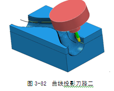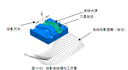 投影曲线精加工策略与直线投影精加工策略非常相似,不同之处在于投影光源不是直线光源,而是一条曲线光源。通俗地,可以理解为一条曲线形氖光灯光源发射出光,在曲面上形成圆形(或者是直线、螺旋线)刀具路径,如图3-63所示。