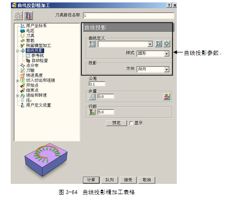 ,打开策略选取器,在精加工选项卡中选择投影曲线精加工,单击“接受”按钮打开投影曲线精加工表格,如图3-64所示。