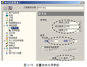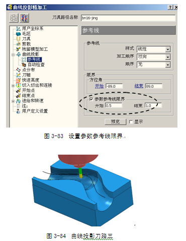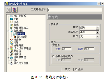 2 参数参考线限界:定义曲线光源的长度。系统用百分率来表示长度。如设置开始值为0.5(即50%),结束值为1(即100%)时,表示只产生曲线中点到曲线终点这一段的曲线投影光线,因此,刀具路径也就只有一半。
