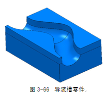 如图3-66所示零件,加工对象是零件中部的一条导流槽。对于这类流道特征的精加工,一般希望刀具路径沿流道的流向分布,解决类似加工需求正是投影曲线精加工策略的特长。另外,为了改善刀具的切削状态,拟配合使用自曲线刀轴矢量控制方法倾斜刀轴来加工。