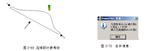 在PowerMILL资源管理器中,再次单击参考线1,在弹出的快捷菜单条中选择“编辑”→“合并”,系统弹出提示信息,如图3-70所示,显示已经将多段曲线合并为一整条。单击“确定”按钮关闭该信息对话框。
