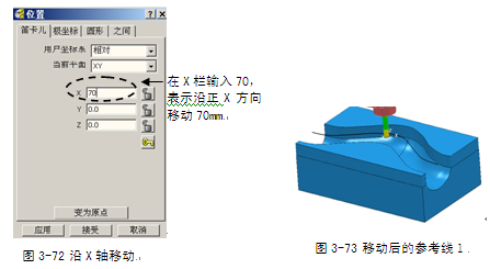 ,打开位置对话框,按图3-72所示设置移动距离和方向。设置完参数后,单击应用按钮,系统将参考线1移到至图3-73所示位置。