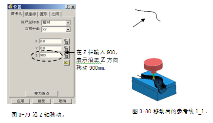 ,打开位置对话框,按图3-79所示设置移动距离和方向。设置完参数后,单击应用按钮,系统将参考线1_1移到至图3-80所示位置。