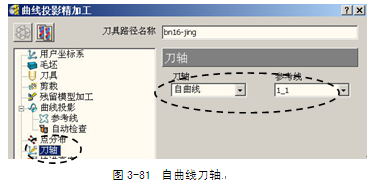 ,重新激活表格参数。在曲线投影精加工表格的策略树中,单击刀轴树枝,调出刀轴选项卡,按图3-81所示设置刀轴参数。