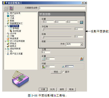 2请读者注意设置平面投影参数的顺序是:首先根据加工对象的位置设置定位点,接着调整方位角及仰角,设置投影方向,最后设置高度及宽度参数。 |