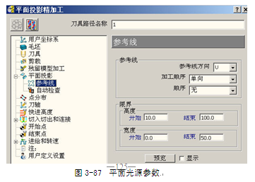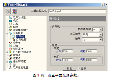 在平面投影精加工表格的策略树中,单击参考线树枝,调出参考线选项卡,按图3-92所示设置参数。