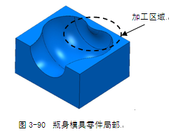 如图3-90所示瓶身模具零件,要求编制底部型面的精加工刀具路径。