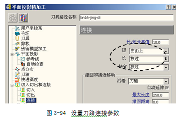 在平面投影精加工表格的策略树中,双击切入切出和连接树枝,将它展开,单击连接树枝,调出连接选项卡,按图3-94所示设置参数。