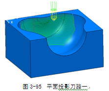图3-96显示,平面投影精加工策略已经计算出了负角面的加工刀路,但由于刀轴是垂直的,在加工负角面时,刀杆就会碰撞到零件。