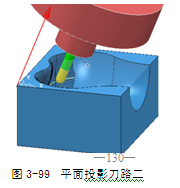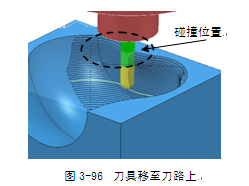图3-99所示刀路中,刀轴倾斜后避开与零件侧向凸出的部位,从而可以进行安全的切削加工。