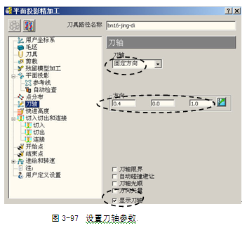 单击平面投影精加工表格中的编辑参数按钮,重新激活表格参数。在平面投影精加工表格的策略树中,单击刀轴树枝,调出刀轴选项卡,按图3-97所示设置参数。