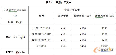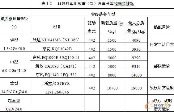 军用载重汽车分为基型越野类,基型变型类和民品选配车三大类。基型越野类就是军用越野汽车基型车,三类车都分轻、中、重和超重四个等级。我军现行装备的载重汽车车型和质量参数列于表1-2之中。