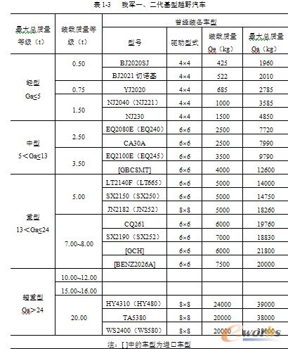 越野汽车系指主要用于坏路和无路地区的全轮驱动的较高通过性能的汽车。也可用作牵引汽车。军用越野汽车分为基型越野汽车和特种越野汽车两大类别。特种越野汽车不少是战略武器运载车。军用越野汽车是我军的基本车型种别。它们可分为轻型、中型、重型和超重型四个最大总质量等级。按总装载质量的大小曾分为0.50,0.75,1.50,2.50,3.50,5.00,7.00~8.00,10.00~12.00,15.00~16.00,20.00t10个等级。曾经编装情况和可能发展的情况以及等级划分情况列于表1-3之中。各等级车型的编配任务如下:
