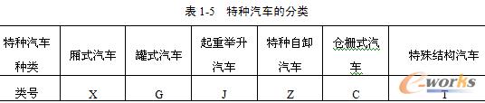 (3)特种车类号是特种车结构和用途特征的代号,第一字母为结构特征代号,参见表1-5。后两字母为具体用途特征代号。