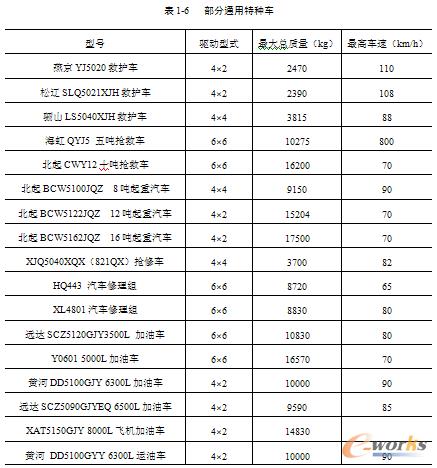 表1-3中的NJ230、CA30A和CQ261等车型已使用近30个年头,早已全部淘汰。进口的外国车型也已淘汰。至于大于24t的超重型车现已开发了多个车型。此外,尚有部份作基型的牵引汽车,没有列入表1-3之中。