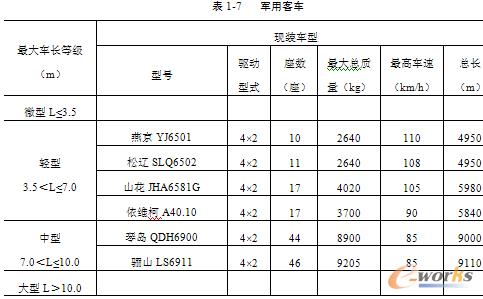 军用客车系具有长方形车厢,主要用于运载人员及其随身行李物品的军用汽车。其编配任务在于保证机关办公和集体活动等日常生活用车。按车身总长度L的大小分为微型、轻型、中型和大型四个级别。我军曾装备的车型及其主要参数见表1-7。